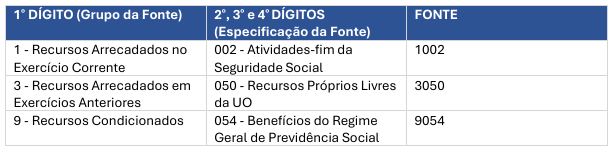 A estrutura do código da fonte possui quatro dígitos: o primeiro indica o grupo e os demais especificam a origem.